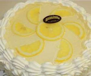Sockerkaksbotten med fyllning av vaniljkräm och lemoncurd. Garneras med grädde, citronskivor och gelé.