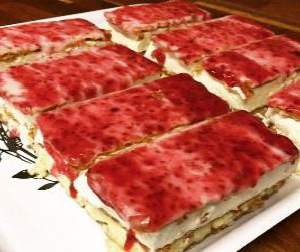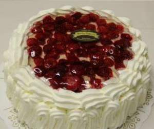 Sockerkaksbotten med fyllning av vaniljkräm och hallon sylt. Garneras med grädde.