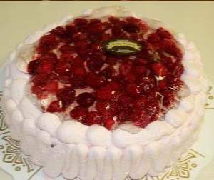 Sockerkaksbotten med fyllning av vaniljkräm och hallonsylt. Garneras med mandel, mandelmassa, bär och gele.