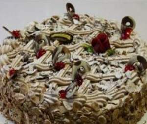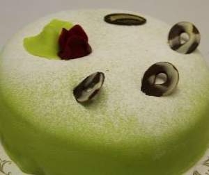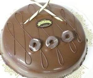 Choklad botten med choklad mousse med 70% choklad, mandelmassa. Garneras med chokladganache överdrag.