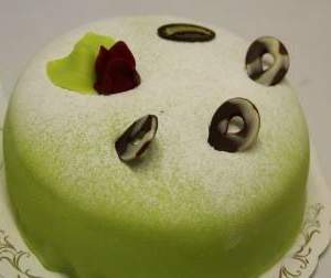 Sockerkaksbotten med fyllning av vaniljkräm, hallonsylt och grädde. Garneras med marsipan.